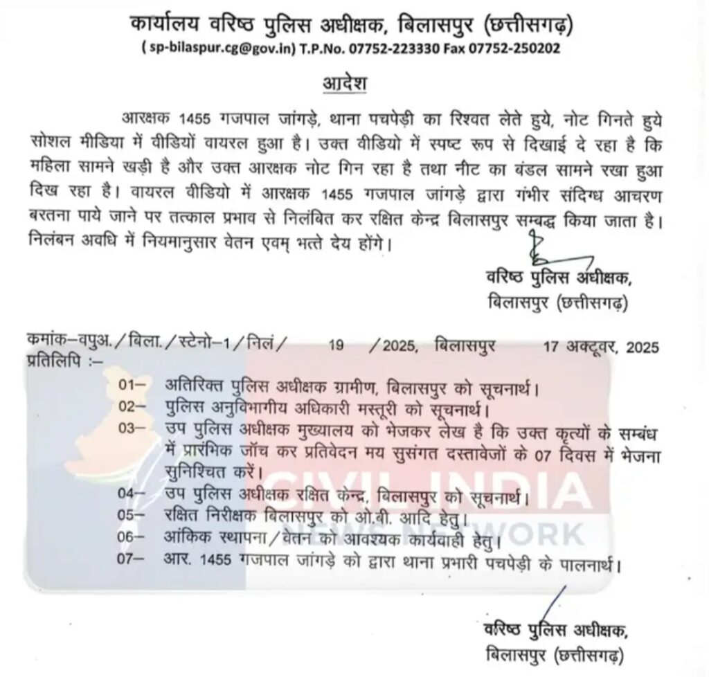 वायरल वीडियो पर संज्ञान लेते हुए एसएसपी ने तत्काल कार्रवाई करते हुए आरक्षक गजपाल जांगड़े को निलंबित कर दिया है और मुख्यालय स्तर पर प्राथमिक जांच के आदेश जारी किए हैं। इस घटना ने एक बार फिर प्रदेश की पुलिस व्यवस्था की ईमानदारी और पारदर्शिता पर गंभीर सवाल खड़े कर दिए हैं। आमजन पूछ रहे हैं कि जब कानून व्यवस्था संभालने वाले ही वसूली में लिप्त हों, तो आम जनता को न्याय कौन दिलाएगा?